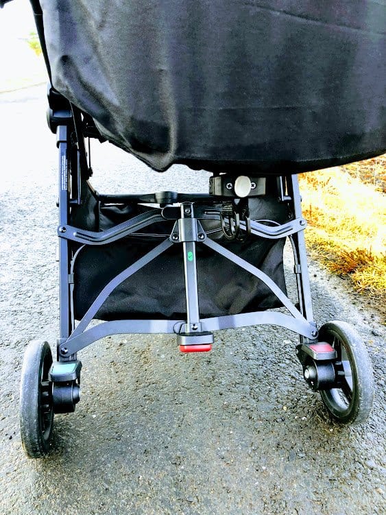 Á kerrunni er fínasta fótbremsa. Hún virkar þannig að stigið er á rauða pedalann hægra megin þegar bremsan er sett á en stigið á græna pedalann vinstra megin þegar bremsan er tekin af. Bremsur sem þessi eru kallaðar „flip flop friendly brake“ erlendis og er tilgangur hennar sá að meiða ekki hálfberar tásur eða skemma skófatnað fólks.